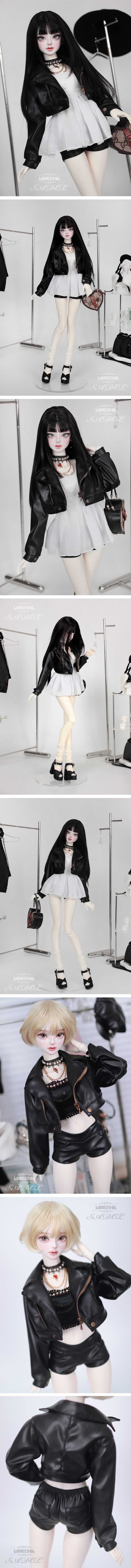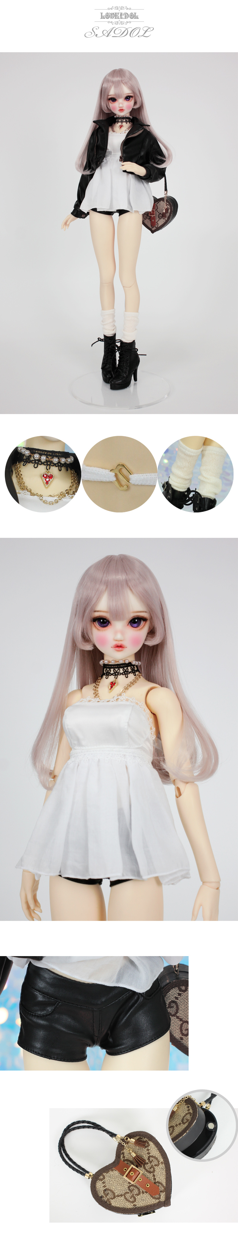 Heart neck choker + rider jacket + top dress + black beaded top + leather hot pants + knit socks